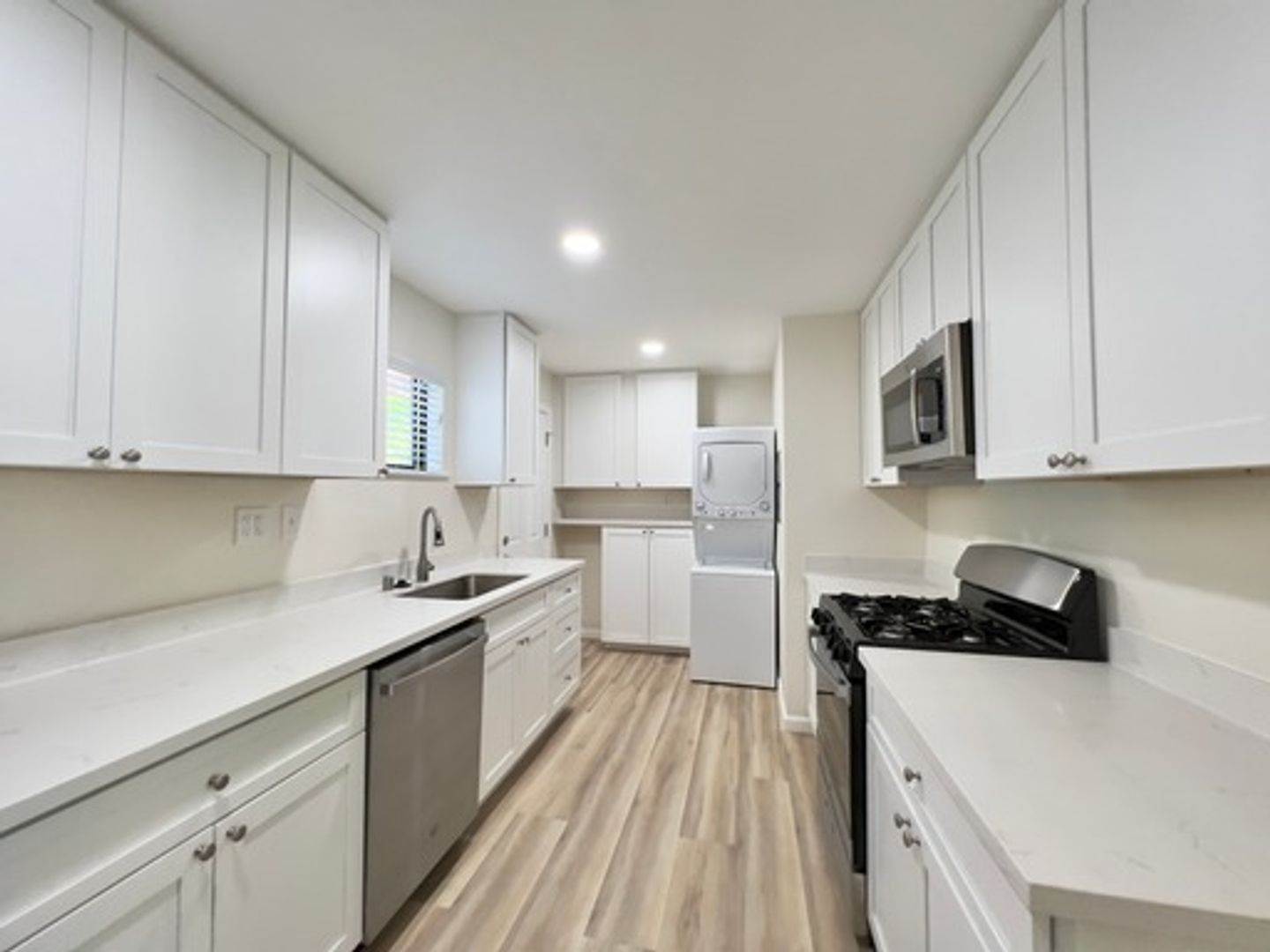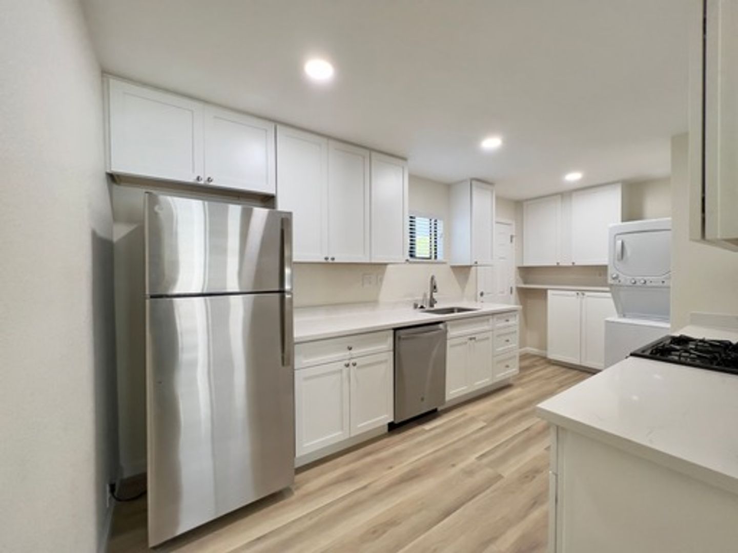 This unit includes premium kitchen cabinets with granite counters, stainless steel appliances, updated bathroom, stacked washer & dryer included and vinyl plank flooring. Assigned carport with storage.