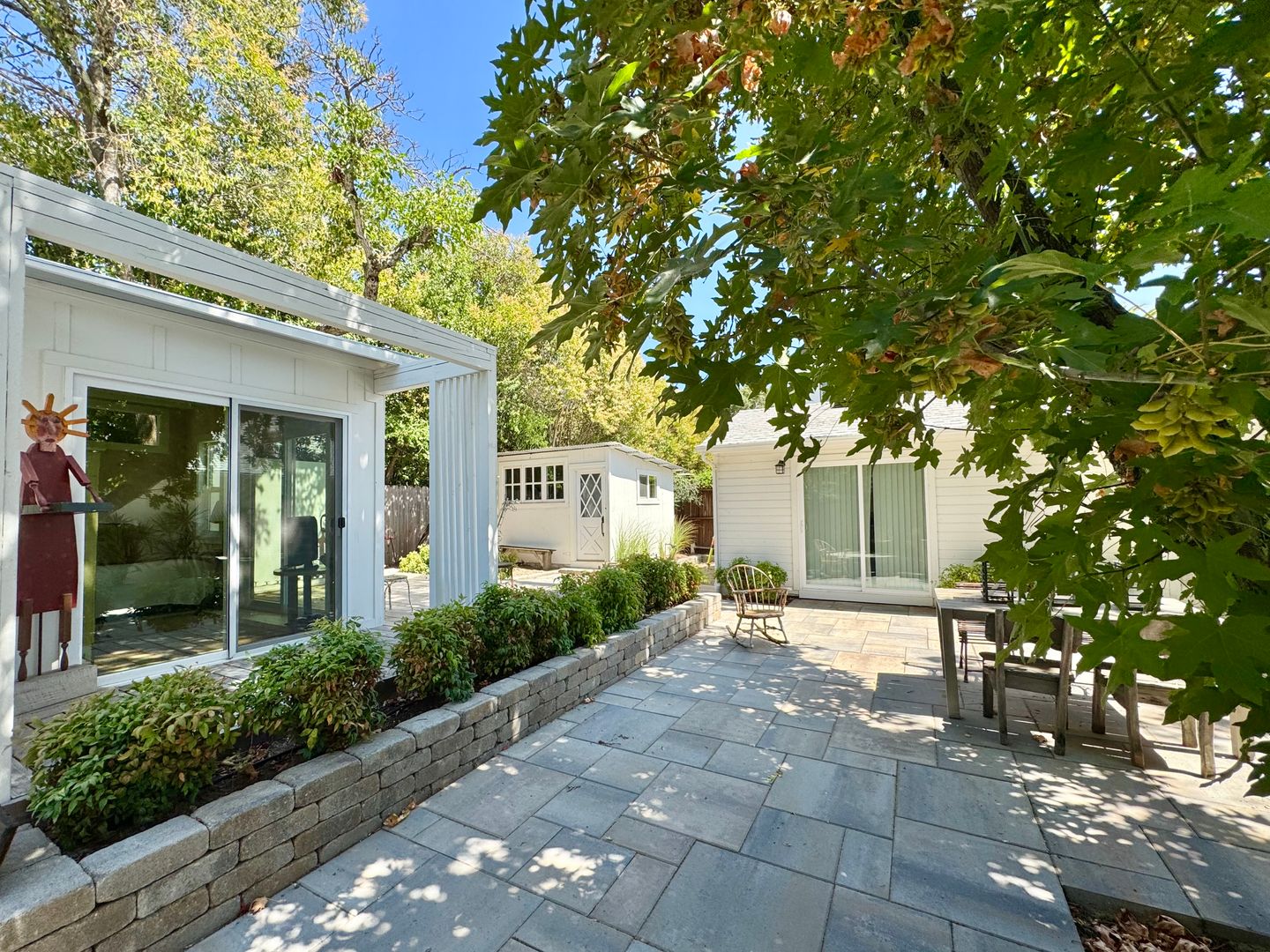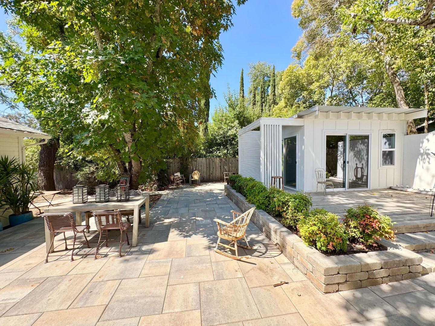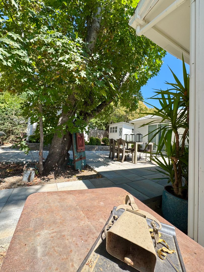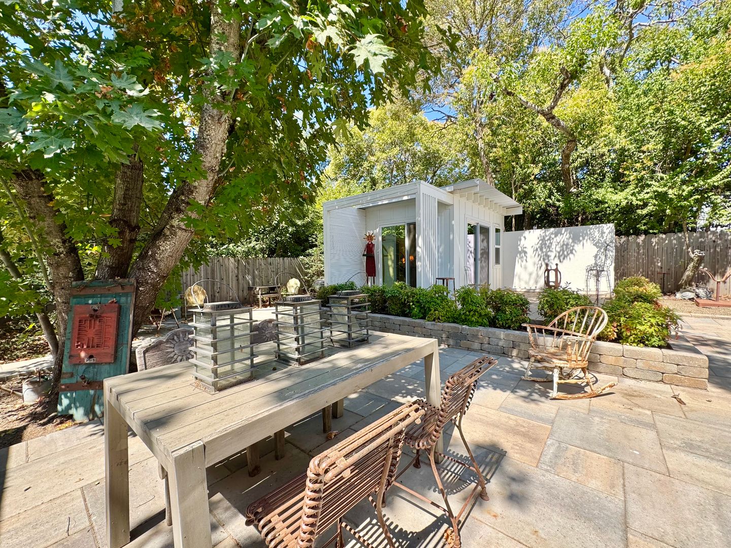 Conveniently located less than half a mile from the vibrant downtown area, the single-story layout features hard surface flooring in the kitchen and bathrooms and wall-to-wall carpeting in the living room, bedrooms, and hallway, creating a warm and inviting atmosphere. The property also includes a detached art studio/office with deck, perfect for those seeking a creative or professional workspace at home. The fenced yard and patio offer a private outdoor space, complete with your own private redwood grove and a detached work room equipped with an animal shower! Landscape maintenance is included four times a year. The home also features an indoor laundry closet with a stacked washer and dryer for your convenience. Central heating and cooling for comfort throughout the year. Access the driveway through the rolling portion of the white picket fence at front for parking. Experience the charm and convenience of living in Saint Helena with this unique offering!